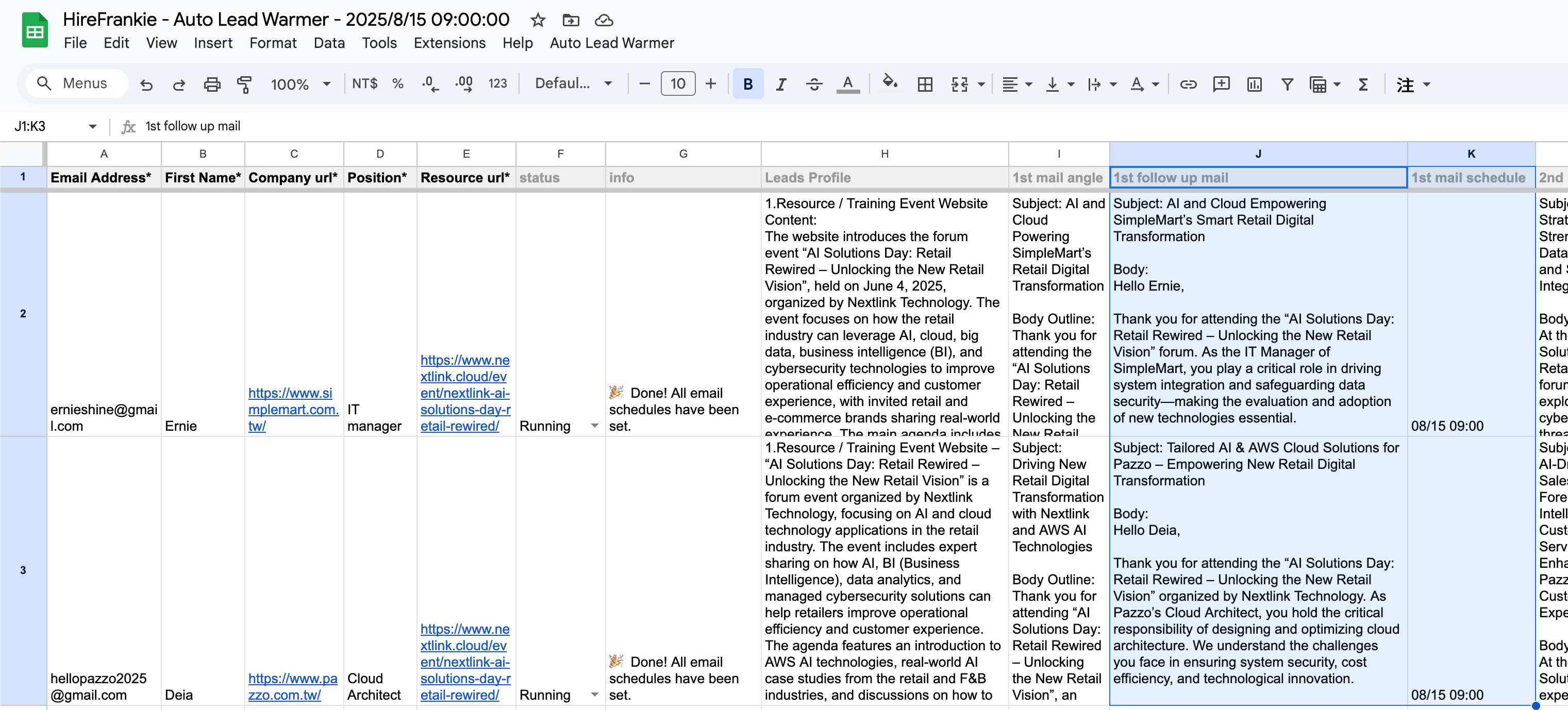 Automatically generates and schedules 3 personalized emails